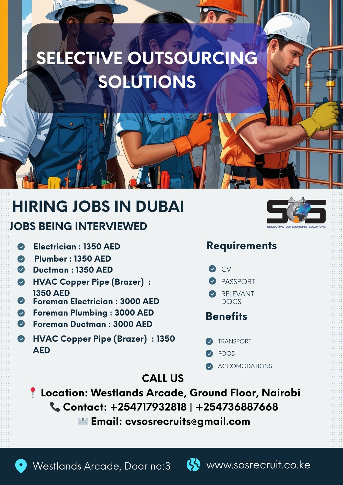 Are you looking for well-paying jobs in Dubai? At Kazikazi Agency, we are recruiting on behalf of our client to connect qualified job seekers in Kenya with genuine employment opportunities abroad. We now have new job openings in Dubai across different sectors, including Electrician, Plumber, Ductman, HVAC Copper Pipe (Brazer), Foreman Electrician, Foreman Plumbing, and Foreman Ductman. Job Vacancies in Dubai for Kenyans